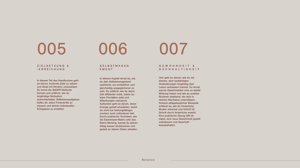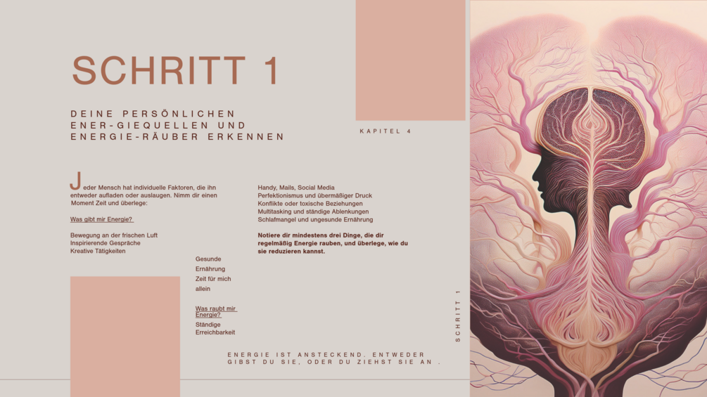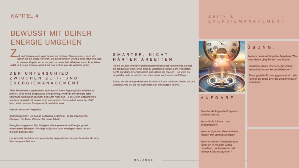 Dieses interaktive Handbuch begleitet dich Schritt für Schritt auf dem Weg zu mehr Selbstfürsorge, Struktur und Klarheit. Mit praktischen Übungen, Reflexionsfragen und einem 30-Tage-Plan hilft es dir, bewusster mit deiner Zeit, Energie und Emotionen umzugehen.